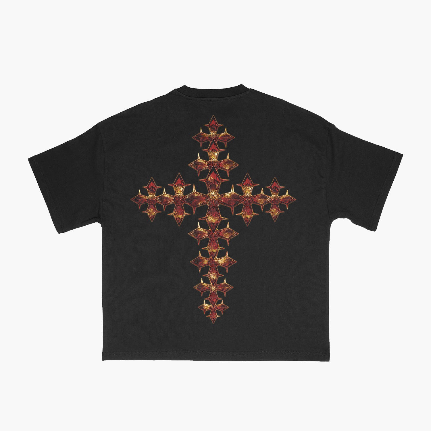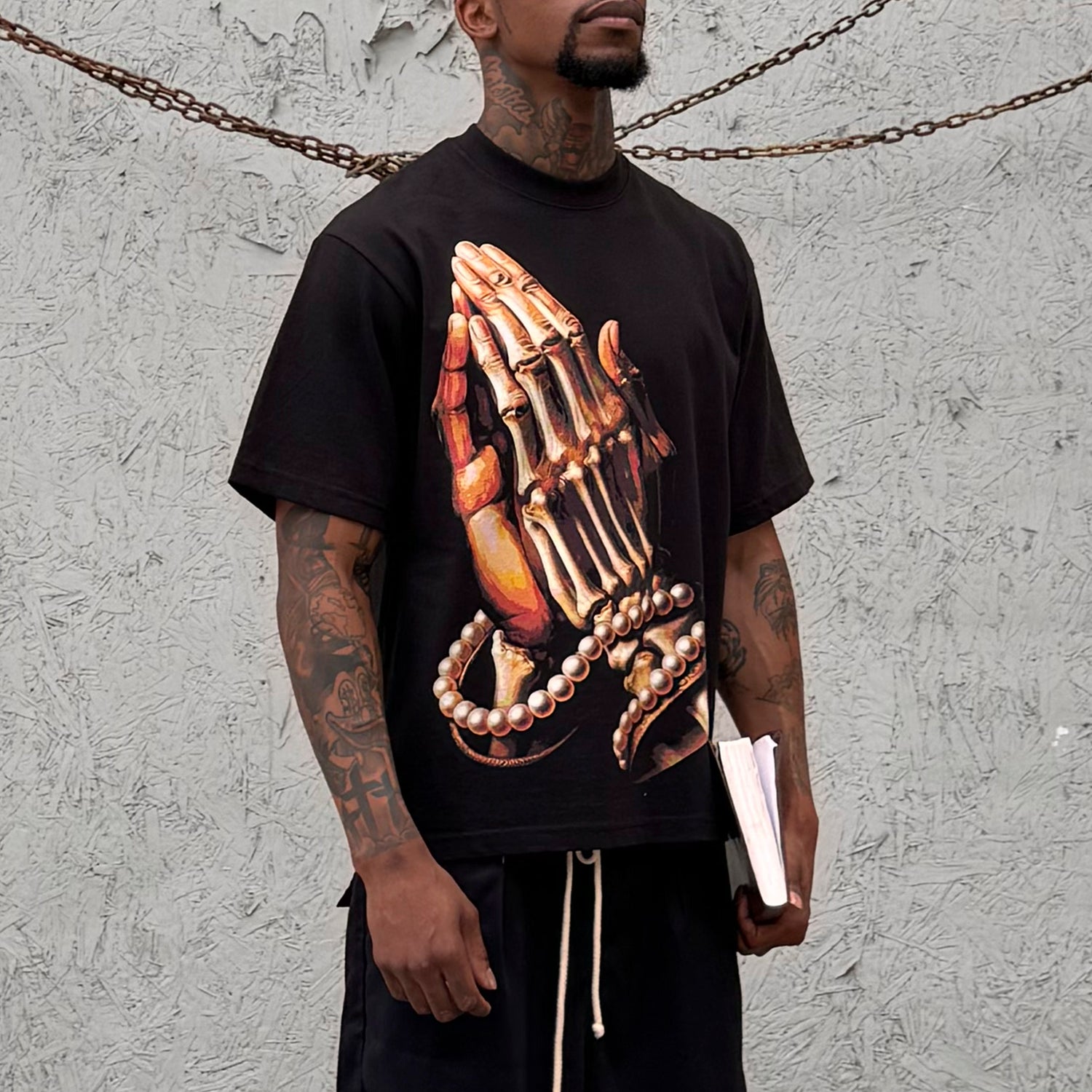 Strength and Devotion. This design highlights the capsule’s centerpiece graphic; praying hands, half flesh, half bone, adorned in pearls on the front. On back is a cross made of our Faith Diamonds. This design is a visual symbol of life, mortality, and unwavering faith. No text, just images that speak louder than words.